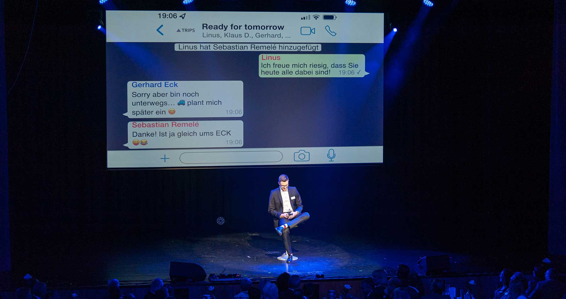Ein besonderes Highlight war die Kombination aus Live-Performance und Medien: Der elektrische Geiger Giacomo eröffnete die Bühne begleitet von Filmszenen aus 20 Jahren Unternehmensgeschichte. Darüber hinaus präsentierte Linus Trips, Sohn des Geschäftsführers, die Talkrunde interaktiv in Form eines WhatsApp-Chats – ein innovativer und moderner Einstieg, der beim Publikum für große Wirkung sorgte.